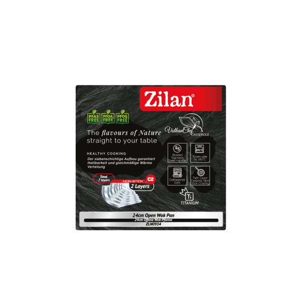 Tigaia Wok Zilan ZLN0934 este construita din 7 straturi de material, avand 2 straturi speciale de materiale pentru a evita lipirea mancarii de tigaie aceasta are acoperire antiaderenta C2 in interior.