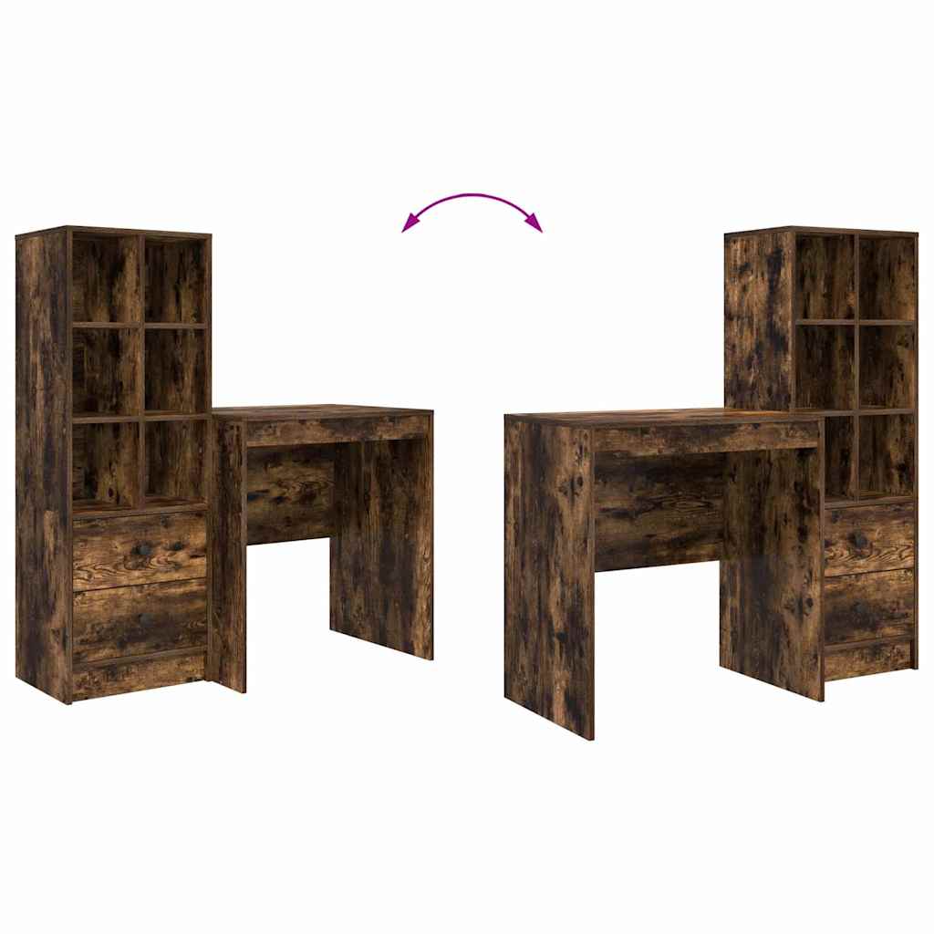 Biroul vidaXL cu stocare aduce un vibe modern în orice zonă de lucru sau birou de acasă. Făcut din lemn prelucrat de calitate cu finisaj de stejar afumat, îmbină stilul cu utilitatea, oferind un loc elegant și versatil pentru studiu, scris sau muncă la calculator.