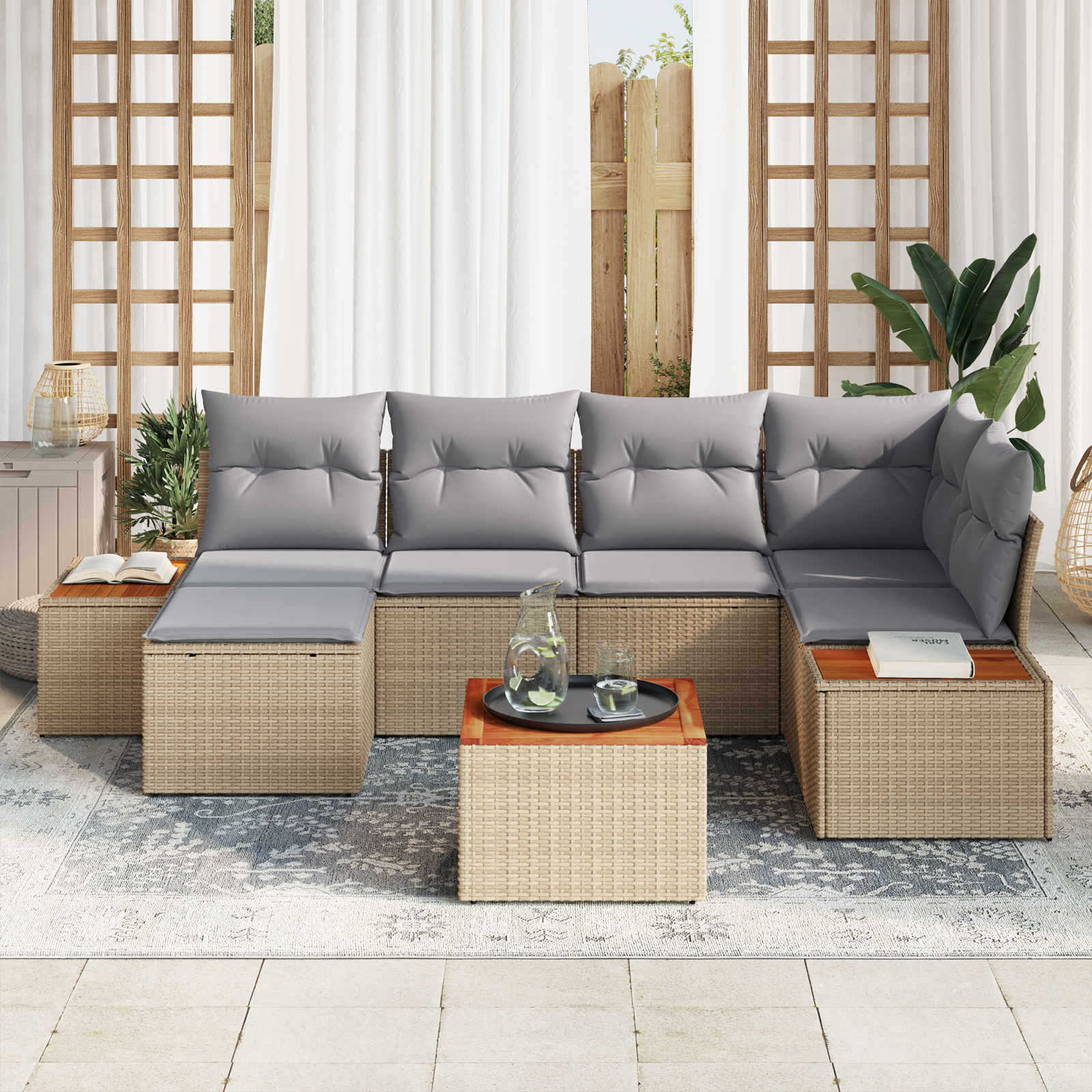 Setul ăsta de canapea e menit să-ți îmbunătățească relaxarea în aer liber, cu stilul lui elegant și layout-ul practic. Ratanul împletit manual, împreună cu pernele moi bej și gri deschis, dă un vibe fermecător și comfortabil, ideal pentru întâlniri pe balcon sau patio.