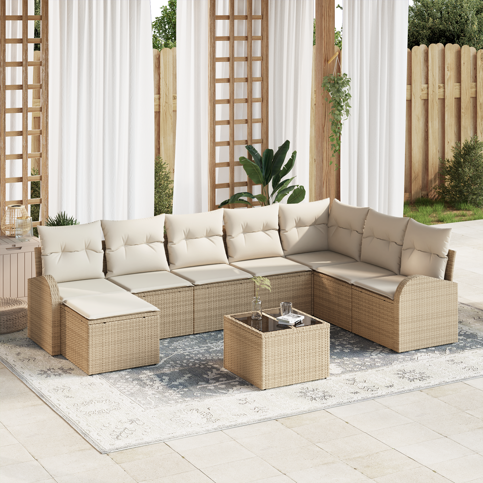 Canapeaua asta secțională de grădină îți creează un loc primitor pentru relaxare și distracție afară. Are un design șmecher și piese țesute manual, care combină stilul modern cu utilitatea, făcând relaxarea în aer liber o joacă.