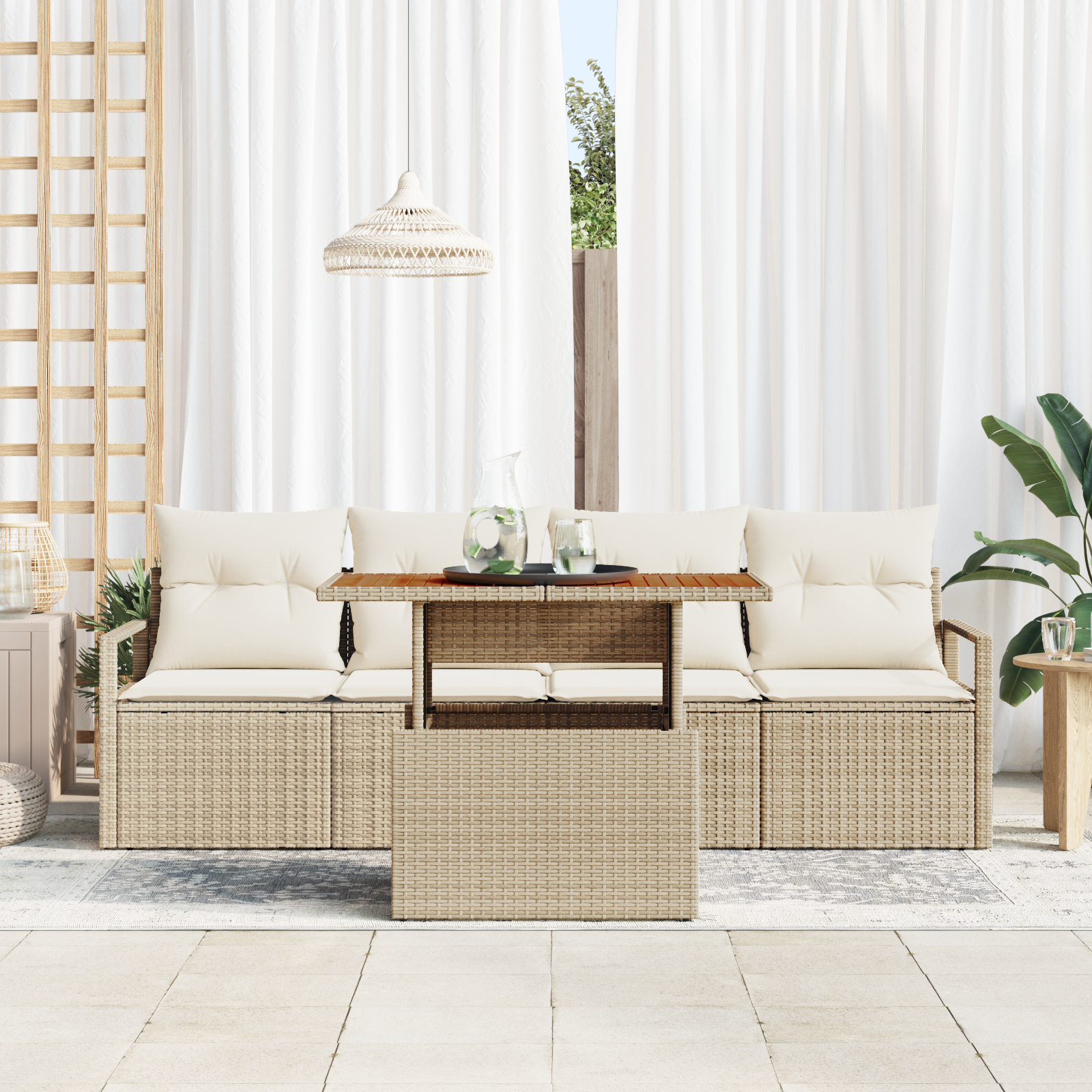 Acest set de canapea pentru grădină cu 5 piese și perne bej transformă orice colț afară într-un loc chic perfect pentru relaxare și distracție. Designul modern din ratan bej nu numai că arată bine, dar îți dă și o atmosferă confortabilă, ideală pentru terase, balcoane sau grădini.