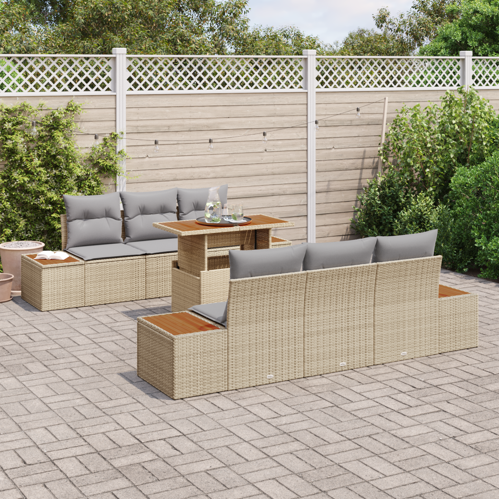 Setul de canapea pentru exterior cu 7 piese aduce lux și confort, perfect pentru întâlniri sau relaxare. Designul fain în tonuri de bej și gri deschis, dă un strop de clasă oricărui patio, balcon sau grădină.