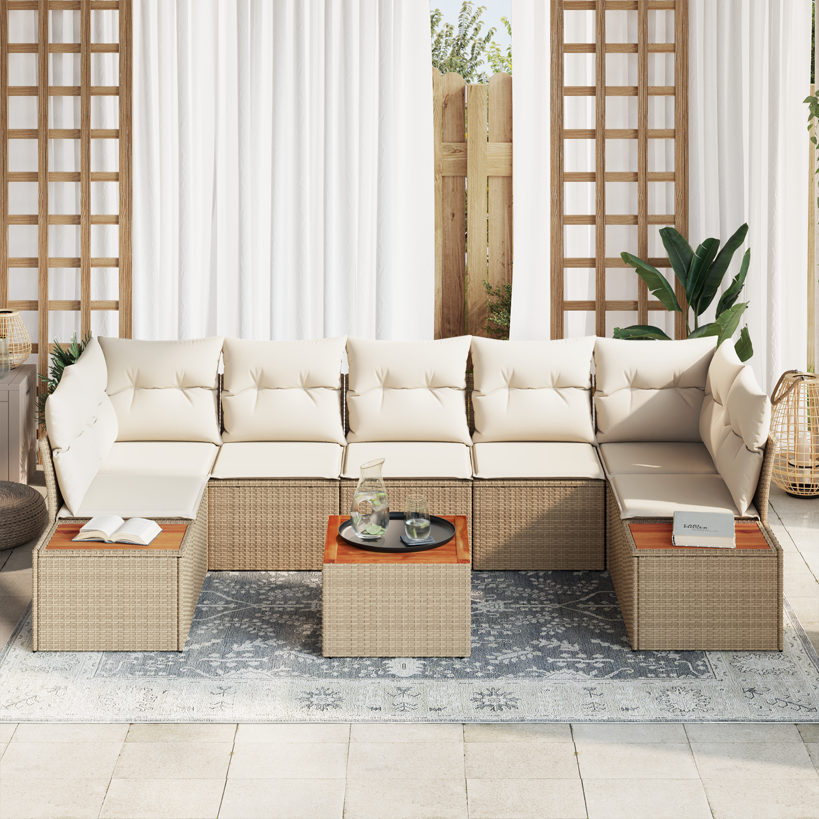 Setul ăsta fain de canapea pentru grădină leagă stilul cu utilitatea, fiind bun atât pentru interior, cât și pentru exterior. Cu designul său modular, îl poți aranja cum vrei, perfect pentru a-ți distra oaspeții sau pentru a te relaxa afară.