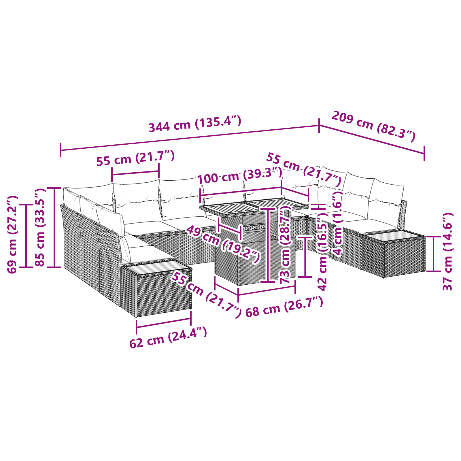 - Delivery Contains: 2 x Side sofa including storage function, 2 x Corner seat including storage function, 6 x Centre seat including storage function, 1 x Garden table