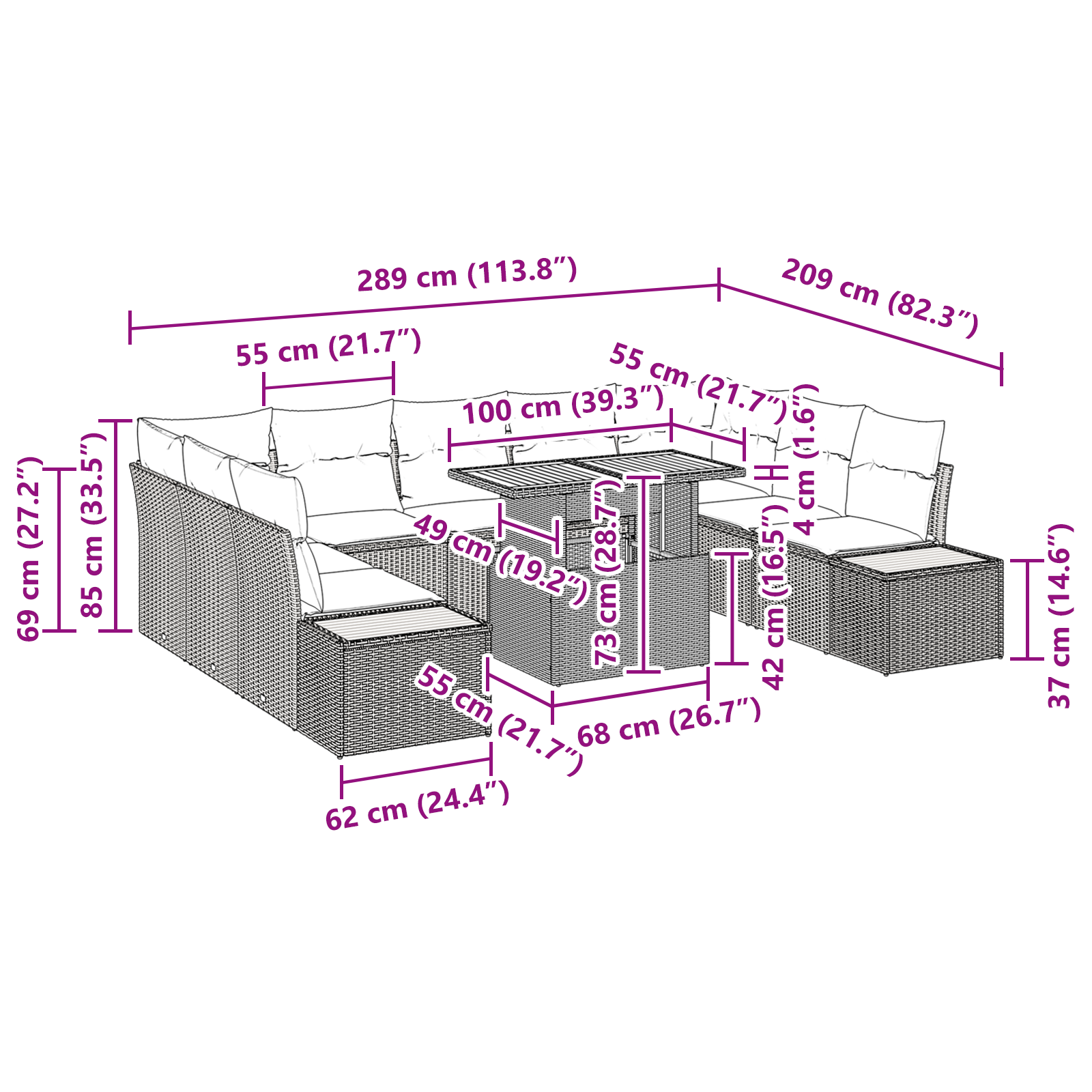• Delivery Contains: 2 x Side sofa including storage function, 2 x Corner seat including storage function, 1 x Centre seat including storage function, 1 x Garden table