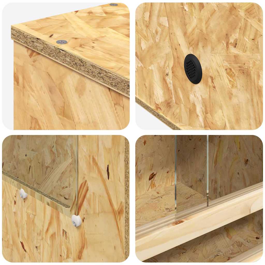 - Materiale durabile: Acest terariu are o structură din OSB (Placă de fibre orientate), ceea ce îl face foarte rezistent și elegant. Panourile robuste permit terariului să reziste animalelor pline de energie sau mutărilor frecvente fără a se strica. Ușile din sticlă securizată îi dau un aspect atrăgător și asigură siguranța.