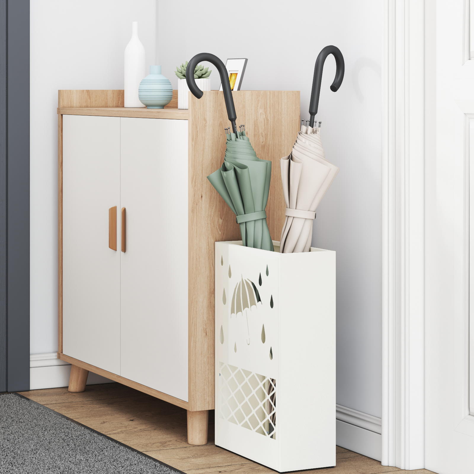 Suportul ăsta modern e o soluție practică și faină să menții totul în ordine în intrarea ta. E ideal pentru umbrelele ude și nu face mizerie. Cu forma sa dreptunghiulară și finisaj alb stylish, se potrivește în orice stil. De asemenea, e foarte util pentru a păstra și alte lucruri în ordine.