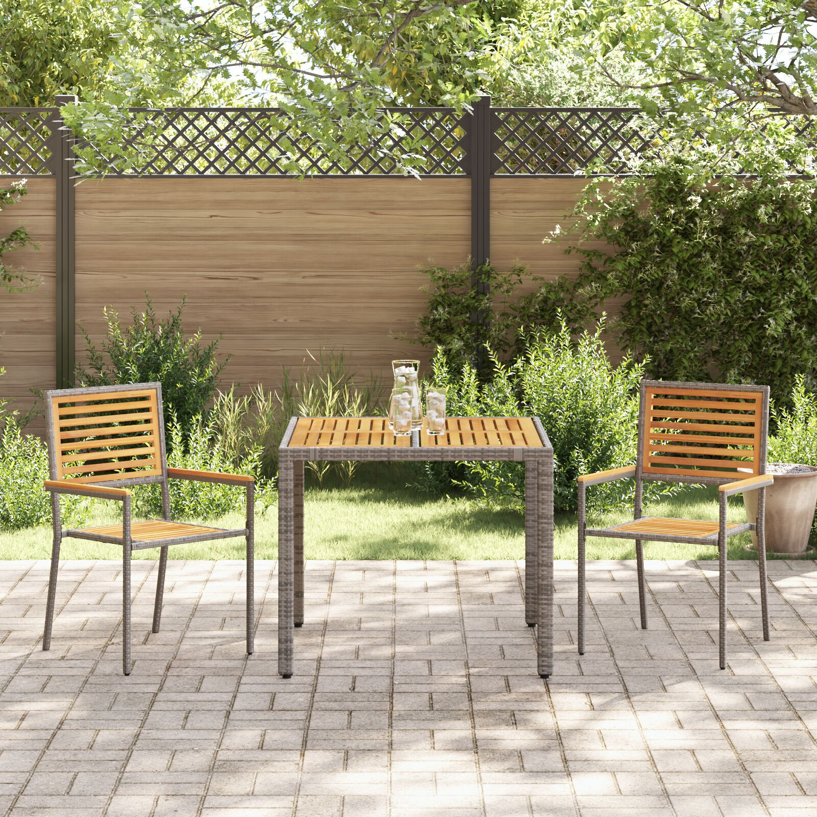 Setul ăsta fain de dining pentru grădină are un design modern, cu un cadru gri elegant și accente din lemn natural. E perfect pentru terase sau balcoane, vine cu o masă pentru 2 persoane și două scaune potrivite, excelente pentru mese și întâlniri relaxante.