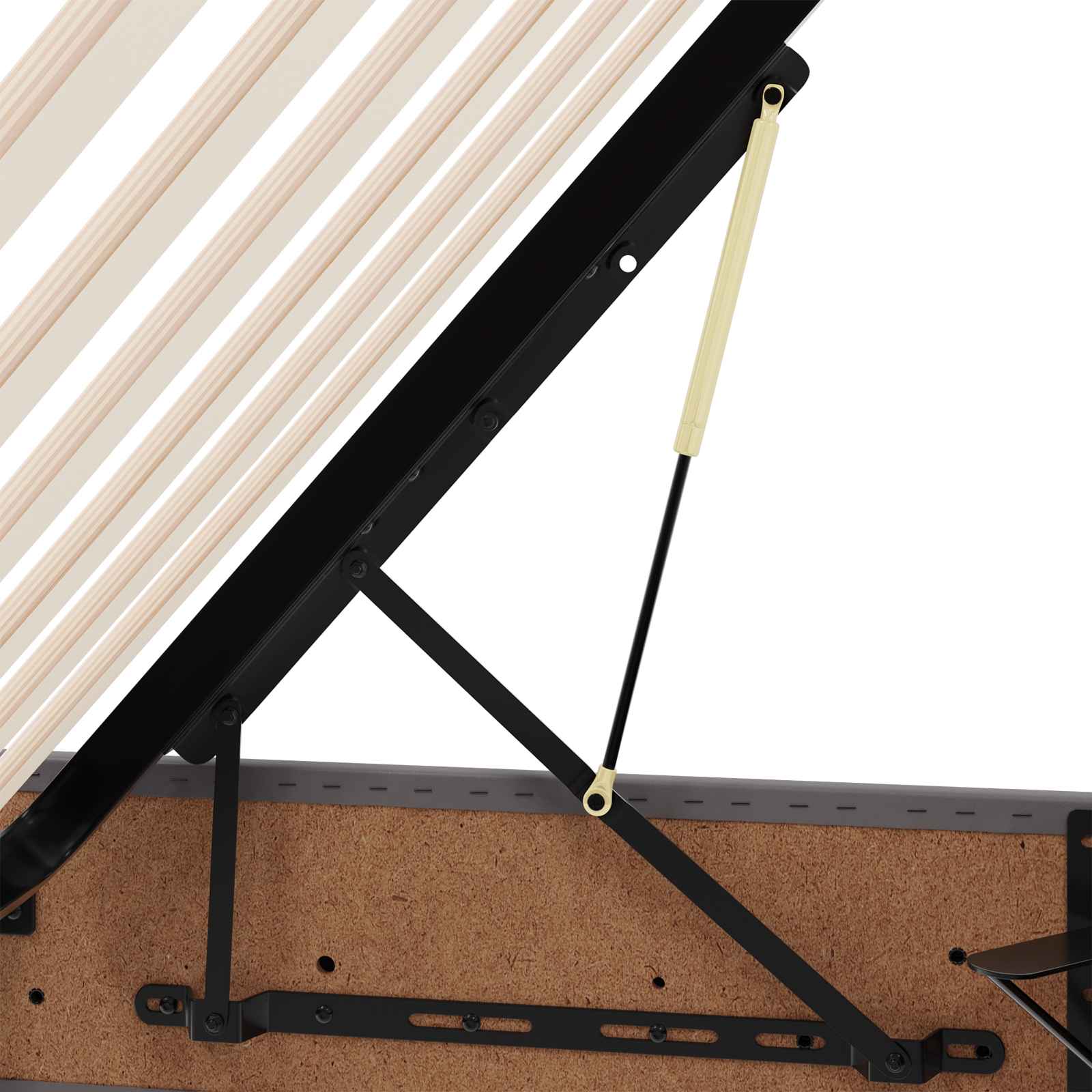 - Sistem de ridicare hidraulic Accesul la depozitul generos de sub pat e super simplu, datorită sistemului hidraulic care ridică salteaua fără efort. E perfect pentru a-ți organiza lucrurile, cum ar fi haine sau lenjerie, optimizând spațiul într-un dormitor mic.