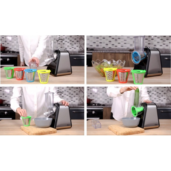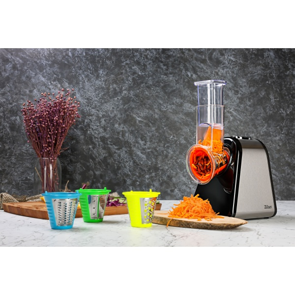 Ingredientele dumneavoastra pot fi taiate sau maruntite la dimensiunea dorita. Pregatirea salatei dumneavoastra preferate nu a fost nicicand mai simpla! Aparatul de facut salata ZILAN SaladMaker imbina puterea unui motor de 200 W cu 4 accesorii pentru taiere legumelor sau fructelor: accesoriu pentru feliat, accesoriu pentru cartofi, acesoriu fin, accesoriu pentru legume tari. Corpul masinii este fabricat din otel inoxidabil si dispune de picioruse cauciuc antialunecare.Piesele se pot demonta rapid pentru o curatare usoara. Putere 200W, sursa alimentare 220-240V