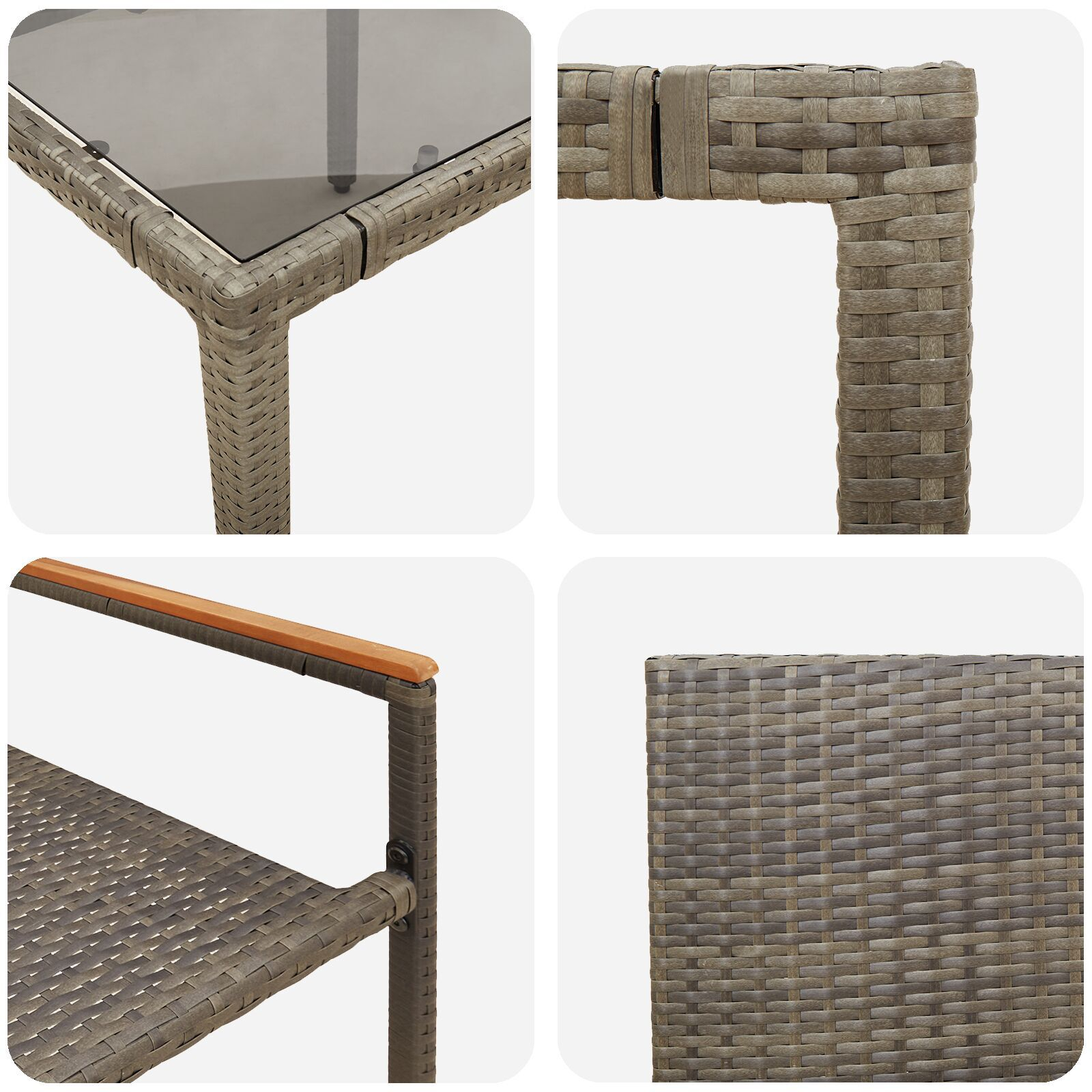 Acest set combină stilul și utilitatea, având un aspect modern perfect pentru mese în aer liber. Finisajul gri elegant, suprafața din poliratan și partea de sus din sticlă texturată arată grozav, fiind ideale pentru grădina ta sau pe balcon.