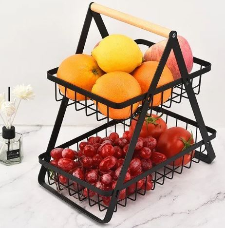 Cos practic, cu doua niveluri, pentru fructe si legume. Fabricat din materiale durabile. Cosul este multifunctional si poate fi folosit si pentru a depozita produse mici de zi cu zi sau rechizite de birou. Este stabil, practic si la indemana, cu manere convenabile pentru transport usor. Cosul de fructe este mentinut intr-o culoare la moda, astfel incat arata izbitor in orice interior. Ideal pentru orice bucatarie sau sala de mese.