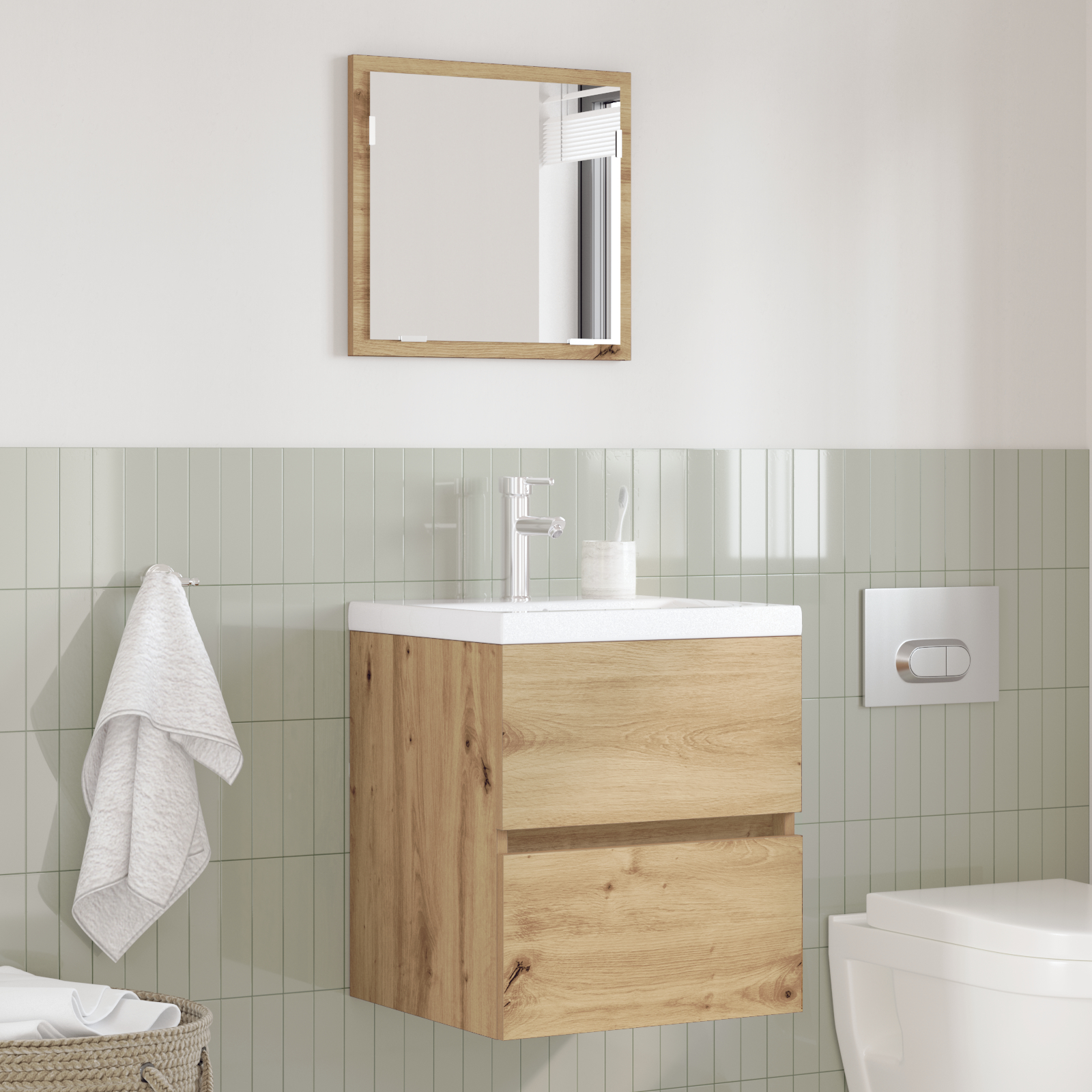 Cabinetul ăsta de depozitare pentru baie din stejar artizanal combină perfect funcționalitatea cu un pic de șarm artizanal. O modalitate ideală de a-ți organiza esențialele de baie. Cu două sertare și o oglindă elegantă, unitatea asta îți transformă spațiul și menține totul în ordine - fix ce trebuie pentru cei care vor stil și eficiență.