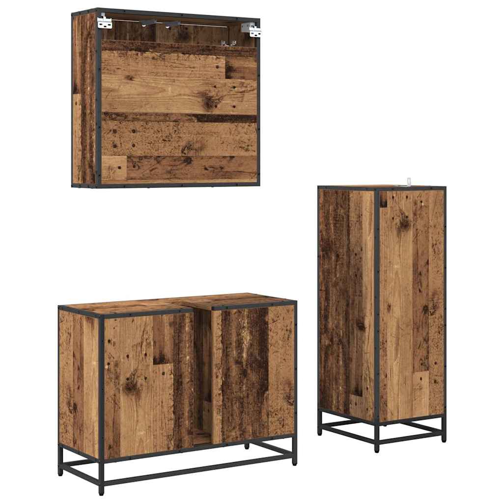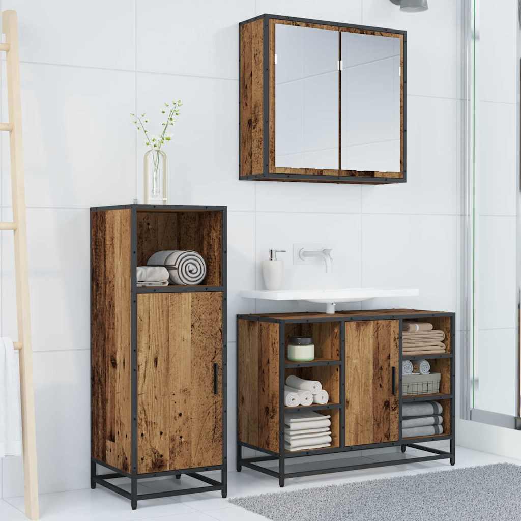 Setul de mobilă pentru baie din lemn e o alegere excelentă pentru oricine vrea să aducă un aer modern și elegant băii sale. Include un dulap cu oglindă, un dulap pentru chiuvetă și un dulap pentru baie, toate făcute din lemn prelucrat și metal. Forma sa rectangulară și designul minimalist se potrivesc perfect în băile contemporane, creând o atmosferă sofisticată care sigur va impresiona. Mixul de tonuri închise și liniile curate adaugă un strop de eleganță, ajutându-te să îți menții casa ordonată și fără haos.