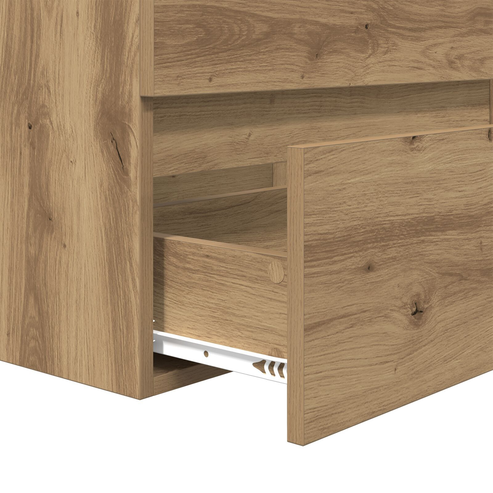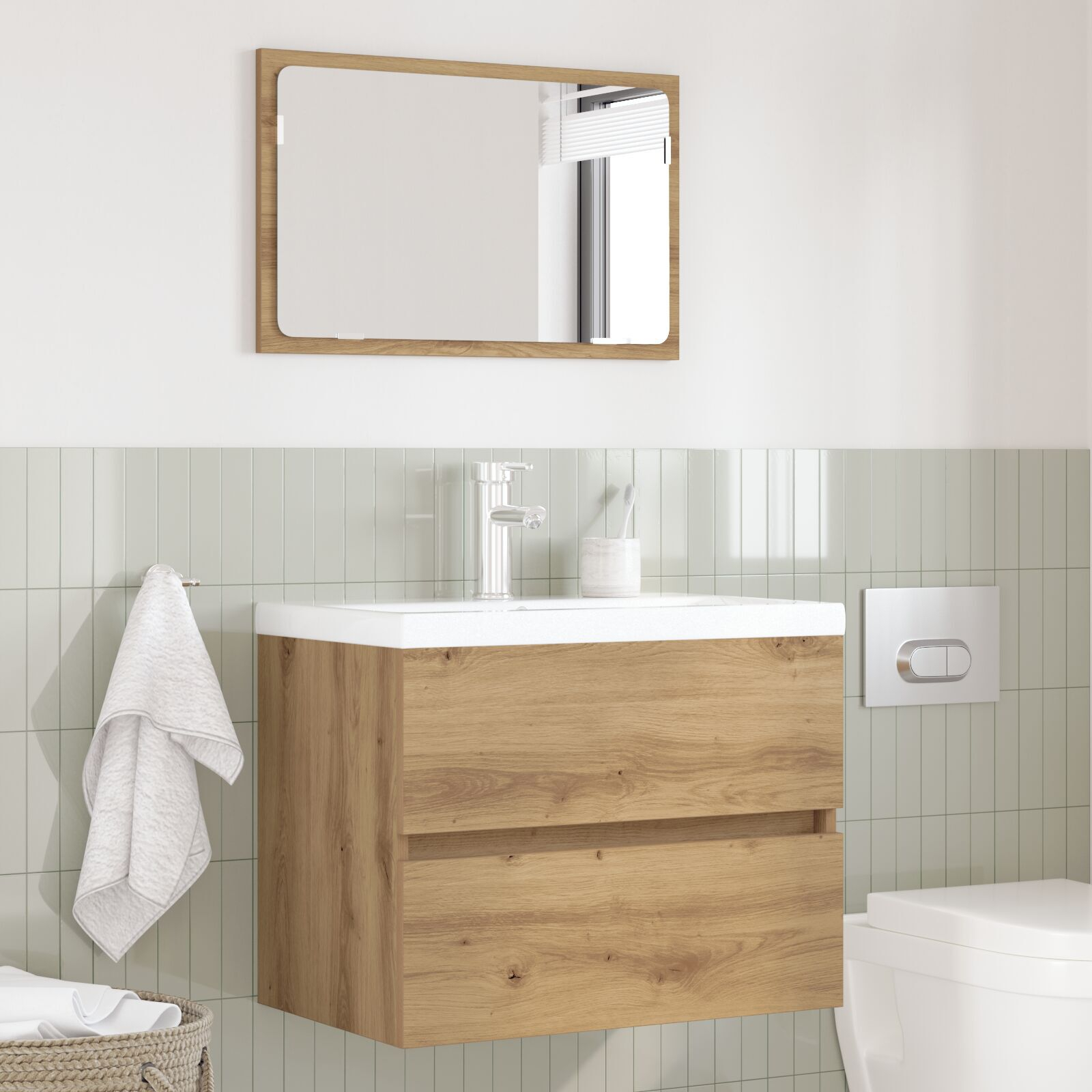 Culoarea stejarului artizanal aduce căldură și stil, iar finisajul mat îl păstrează modern. Setul vine cu un cabinet pentru chiuvetă și o oglindă plată, îmbunătățind zona ta de toaletă.
