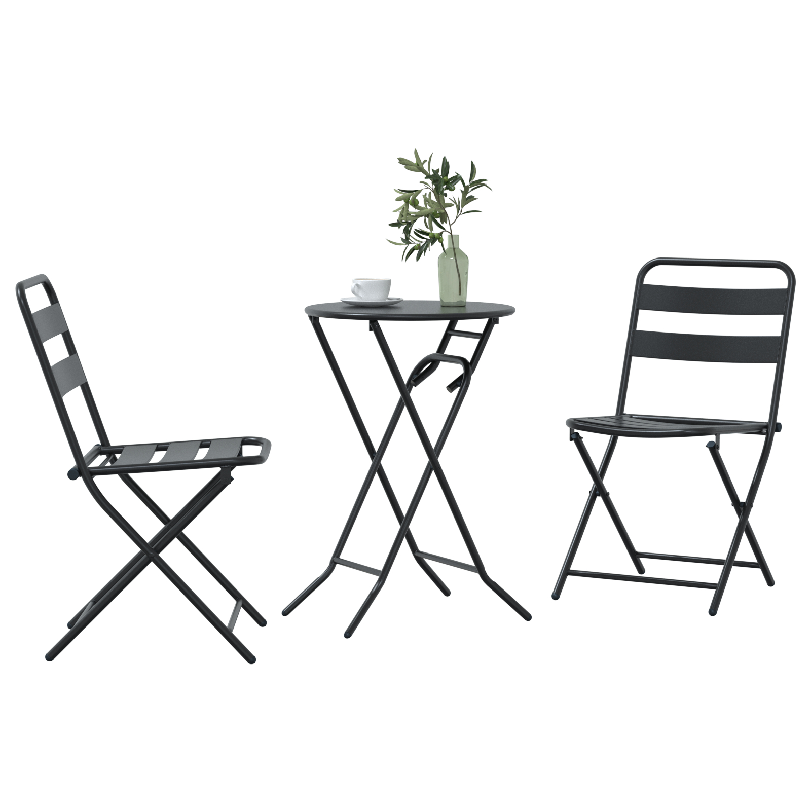 Setul Bistro Pliabil cu 3 Piese e perfect pentru a da un vibe fresh meselor de afară pe balcoane sau pe terase mici. Cu finisajul său antracit elegant, setul asta aduce un stil modern, fiind în același timp practic, iar alegerea perfectă pentru a savura cafeaua dimineața sau mesele de seară cu prietenii.