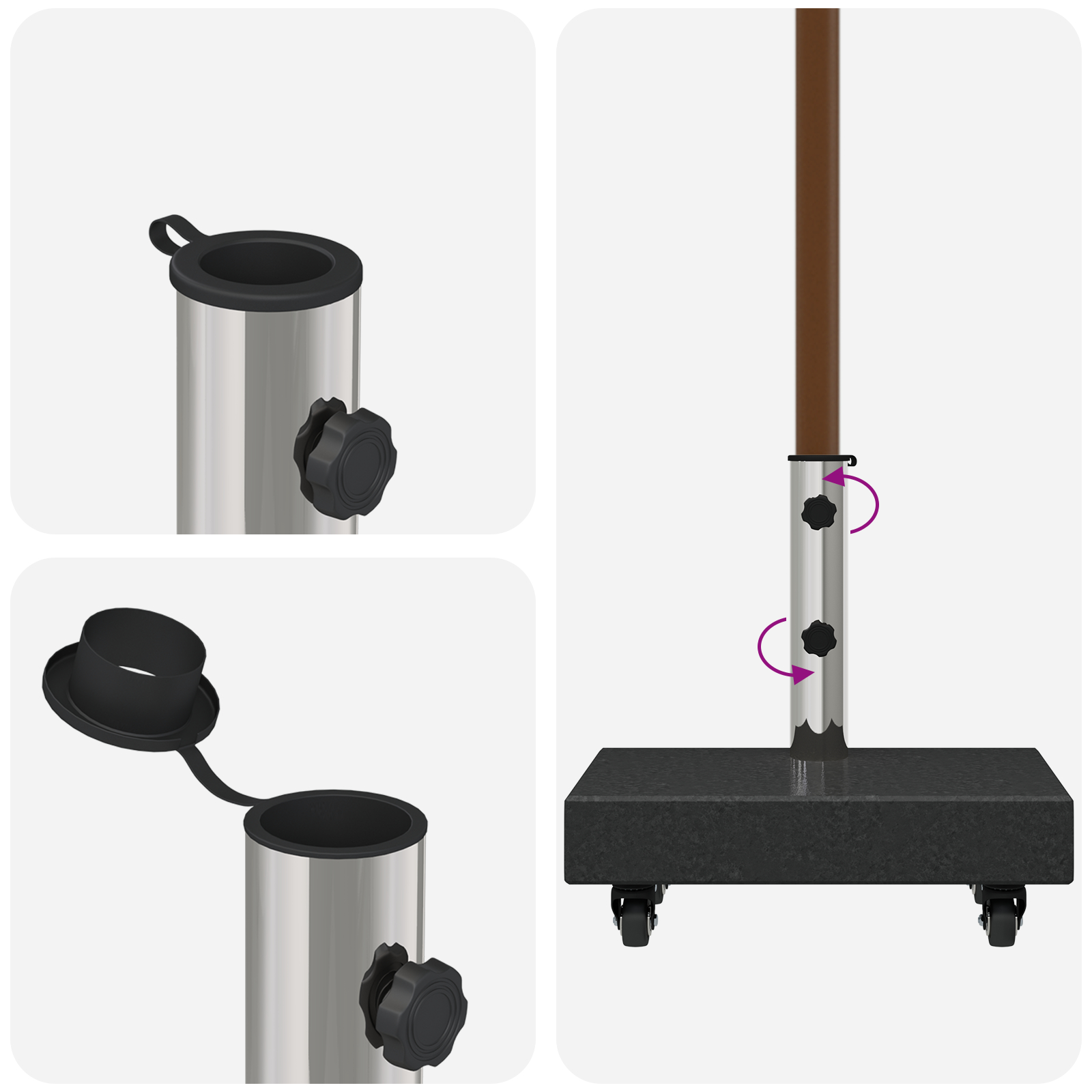 - Portabilitate: Cu roți, poți muta acest suport cu ușurință, astfel ajustarea poziției umbrelei este o joacă de copil.